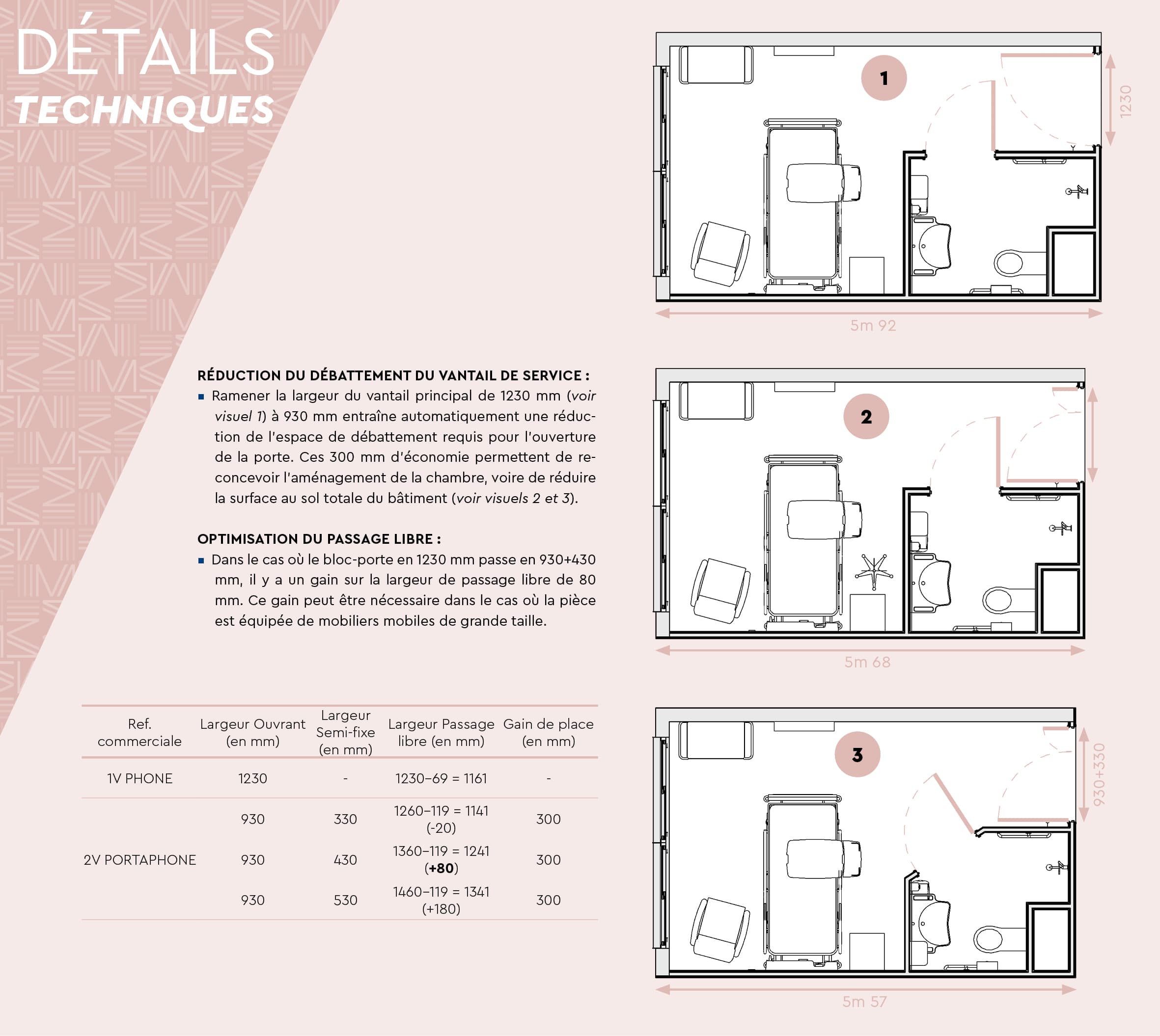 • D’accroître les largeurs de passage réel pour faciliter la circulation d’éléments encombrants, tels que les lits médicalisés de grande taille.