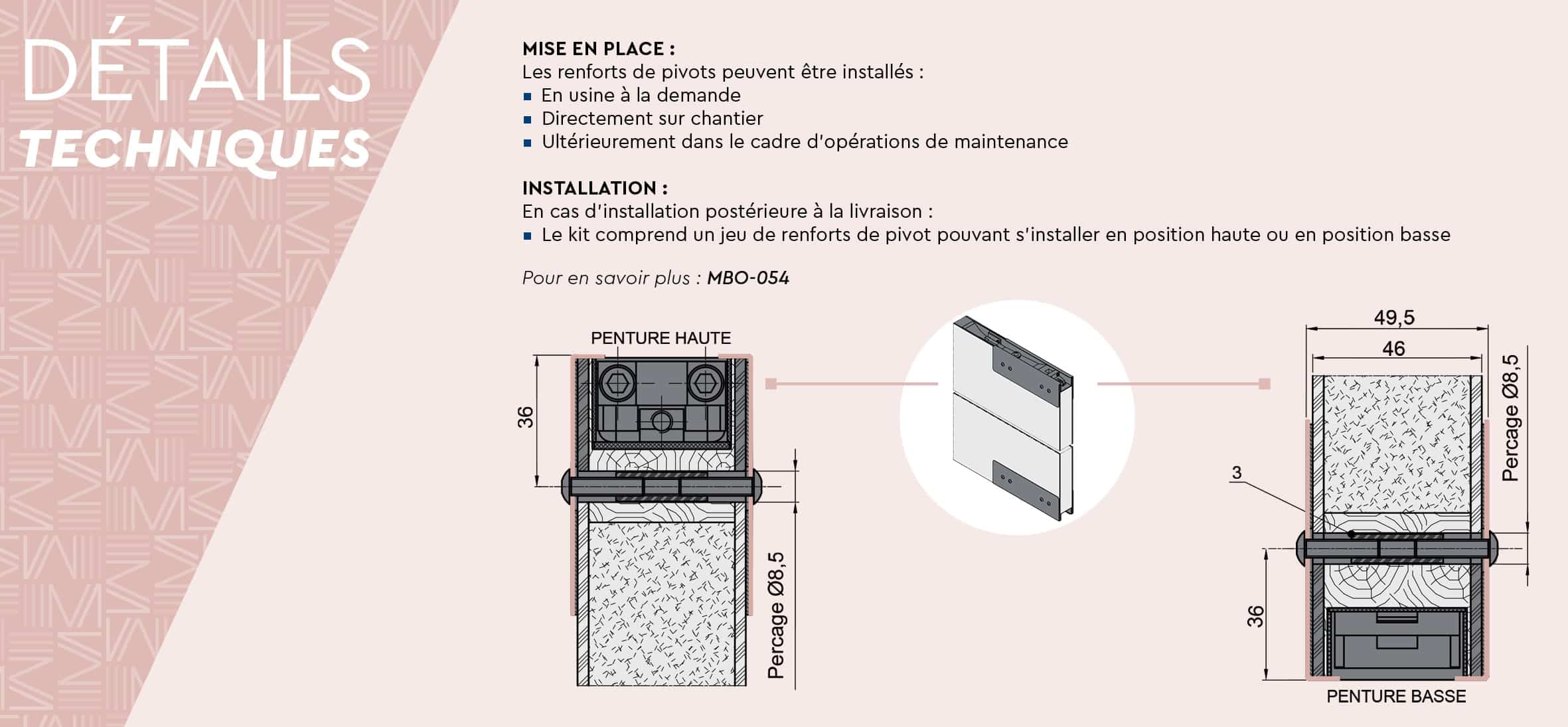 Conçues pour protéger efficacement les blocs-portes va-et-vient contre les effets de poussée qui tendent à distordre le vantail et à fragiliser les zones pivots et crapaudine, les renforts de pivots sont :