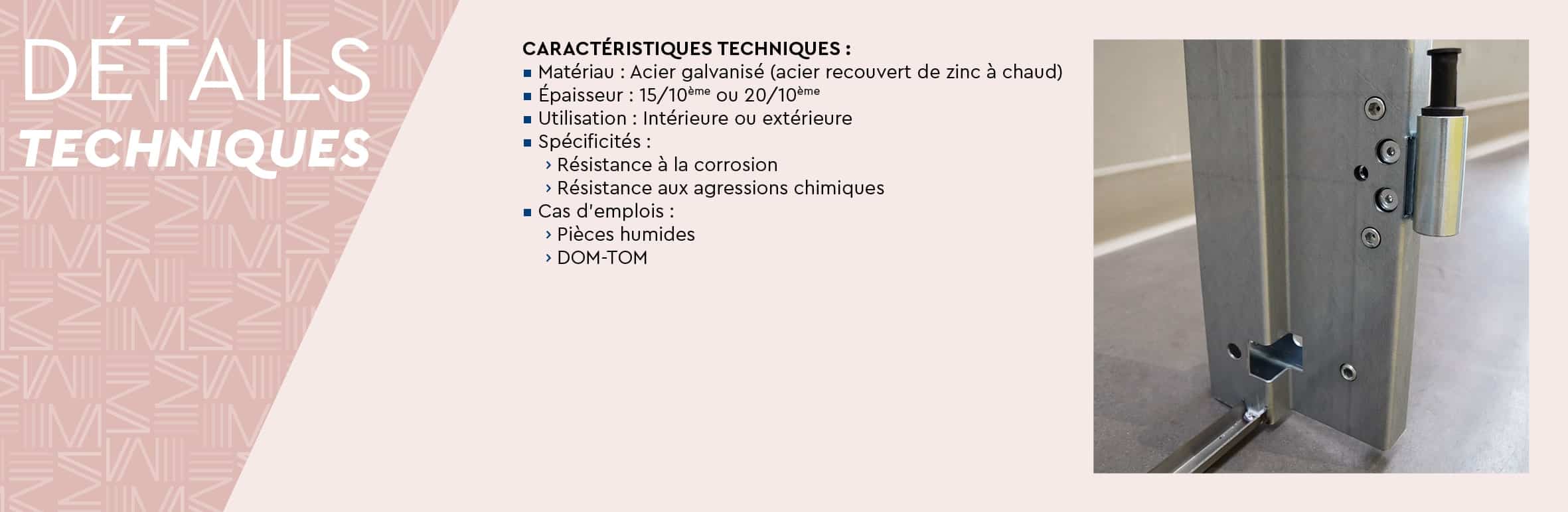 • Le traitement galvanisé est disponible pour l’ensemble des huisseries métalliques MALERBA entrant dans la composition de blocs-portes avec/sans performances techniques. Les huisseries métalliques galvanisées sont livrées brutes et peuvent recevoir une peinture de finition. Elles peuvent également être laquées.